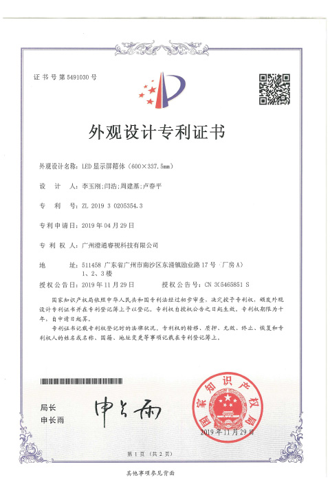• 睿视外观设计专利证书